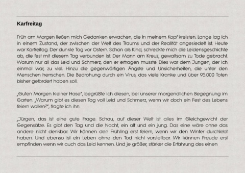 war Karfreitag. Der dunkle Tag vor Ostern. Schon als Kind, schreckte mich die Leidensgeschichte