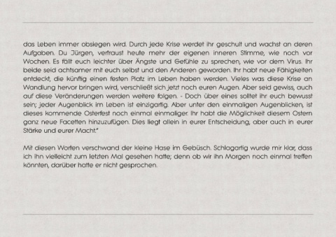 Mit diesen Worten verschwand der kleine Hase im Gebüsch. Schlagartig wurde mir klar, dass